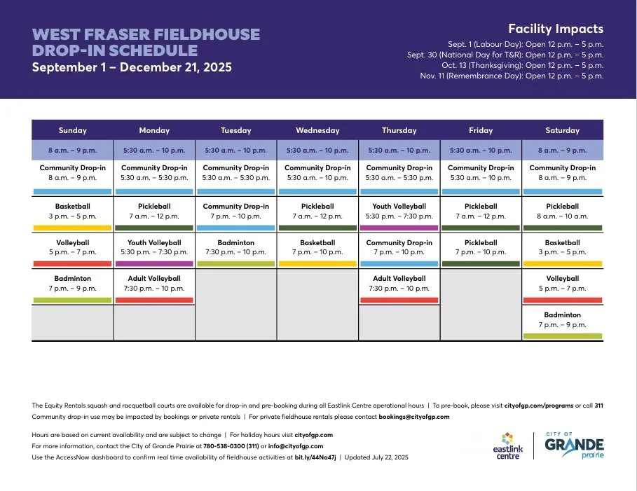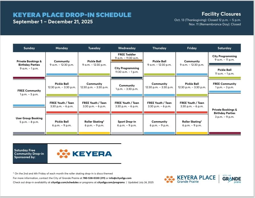 Play Schedules OUTDOOR COURTS11313 -105 Street Public Use Schedule Club Members Schedule Eastlink Centre#10 Knowledge Way Keyera Place 9401 Park Rd, Grande Prairie, AB T8V 7A5